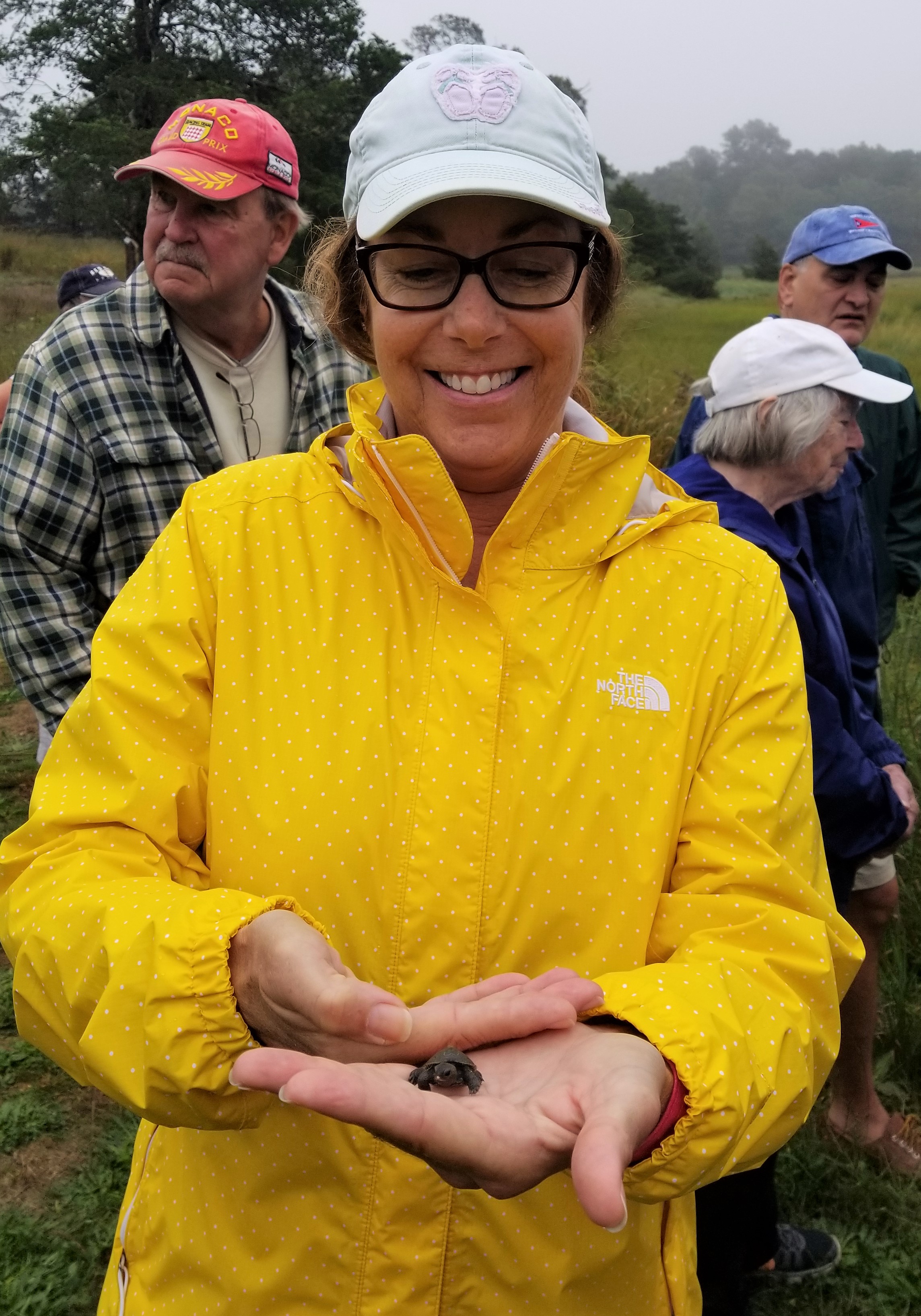 There were four terrapins from protected nests waiting to be released.  After being passed around to the attendees, the youngest participants brought the terrapins to the edge of the marsh.  Everyone spread out to reduce the risk of predation, leaned over into the dense marsh grass, and in a flash the inch long terrapins were gone.