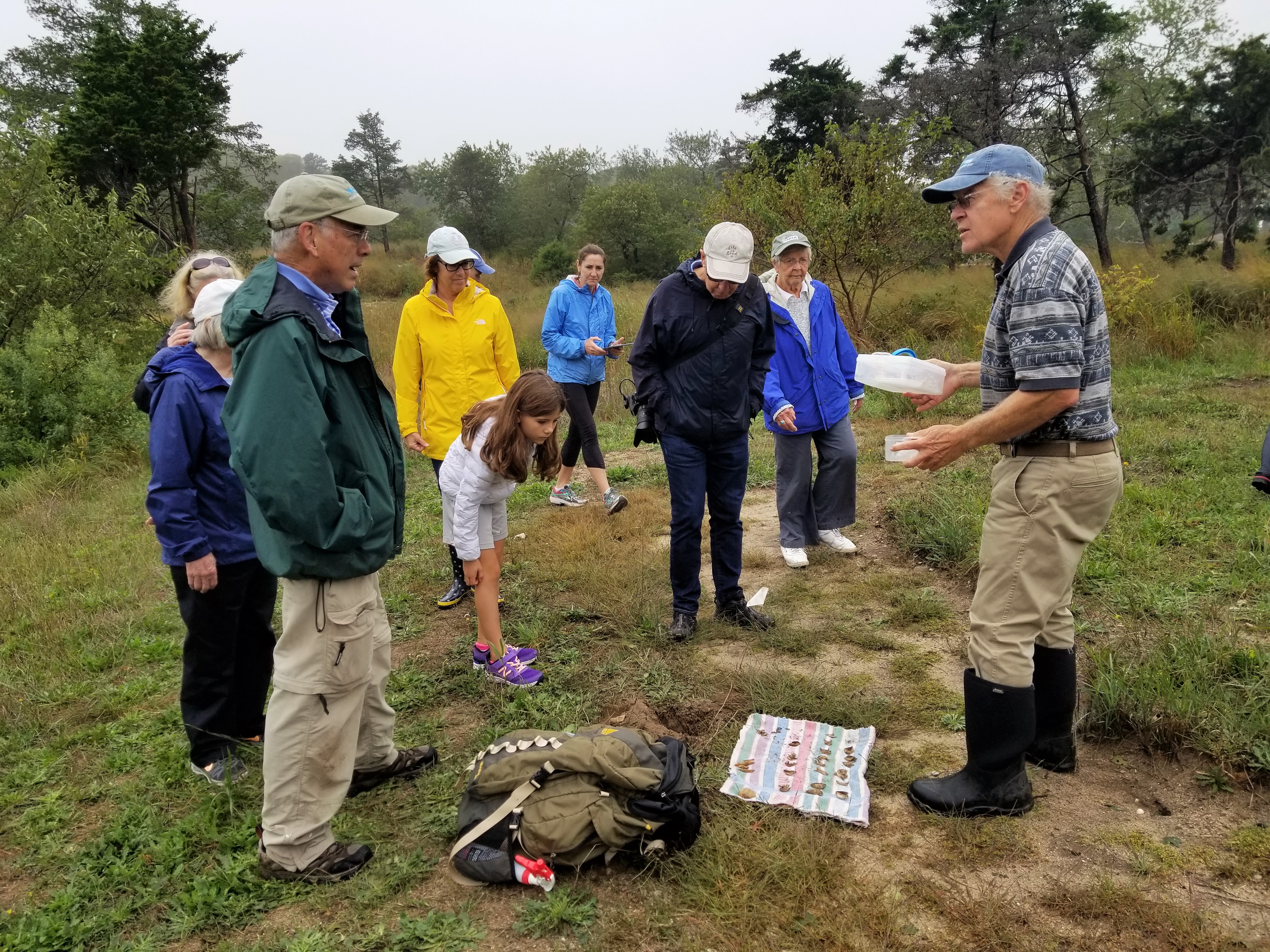 The group then watched as Bob and volunteer Chuck Dow opened a protected nest that had incubated for over 90 days.  Terrapin heads immediately poked out of the soil.  Thankfully, all 13 of the eggs had successfully hatched and the terrapins appeared healthy and alert.  The terrapin babies and egg shards were collected and brought back to the MA Audubon lab in order to be weighed, measured, and observed for any health issues.  They were then released back on site two days later.
