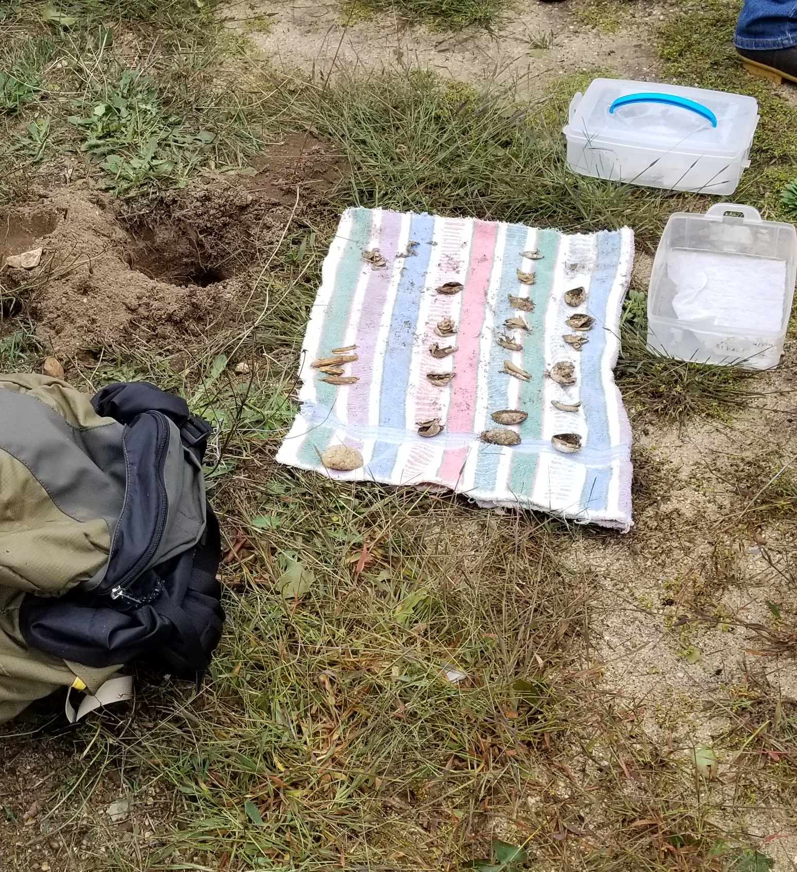 The group then watched as Bob and volunteer Chuck Dow opened a protected nest that had incubated for over 90 days.  Terrapin heads immediately poked out of the soil.  Thankfully, all 13 of the eggs had successfully hatched and the terrapins appeared healthy and alert.  The terrapin babies and egg shards were collected and brought back to the MA Audubon lab in order to be weighed, measured, and observed for any health issues.  They were then released back on site two days later.