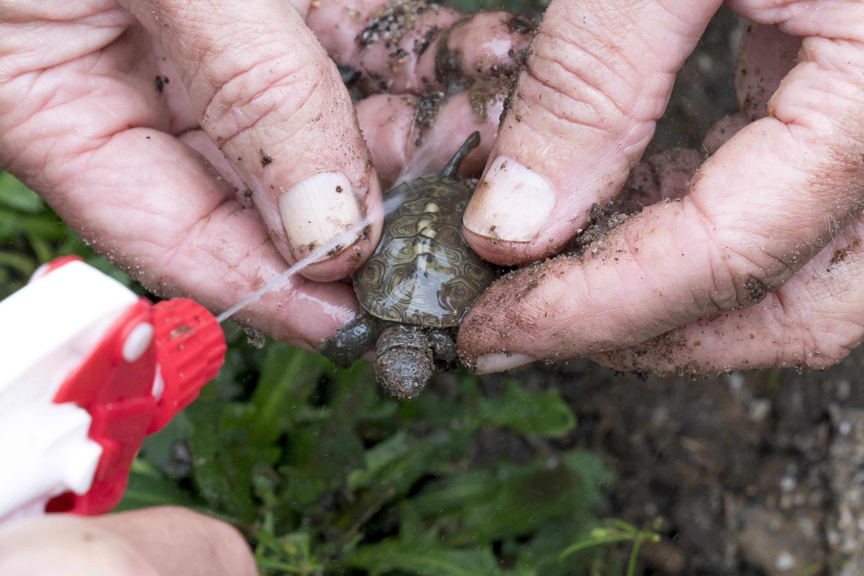 There were four terrapins from protected nests waiting to be released.  After being passed around to the attendees, the youngest participants brought the terrapins to the edge of the marsh.  Everyone spread out to reduce the risk of predation, leaned over into the dense marsh grass, and in a flash the inch long terrapins were gone.