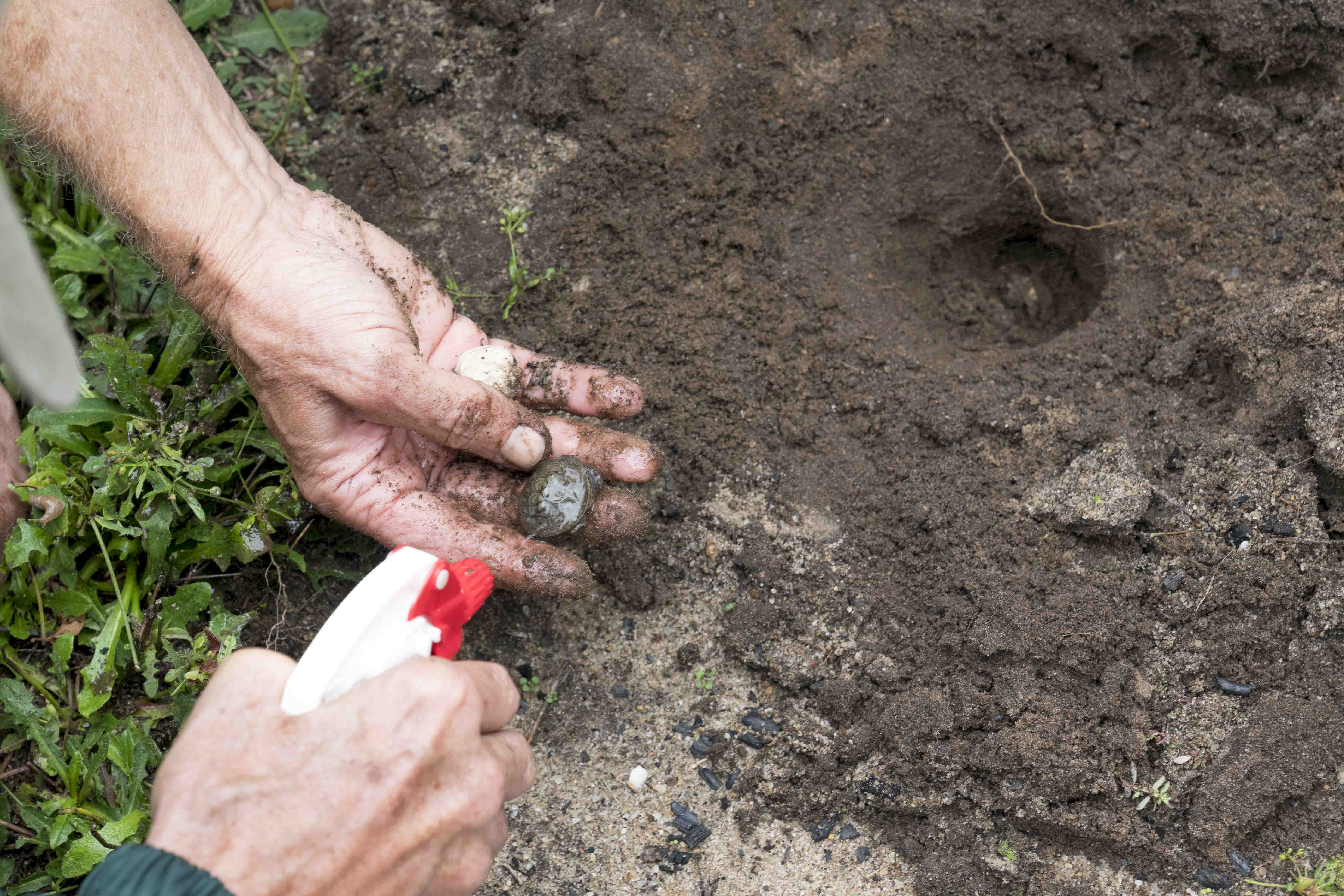 The group then watched as Bob and volunteer Chuck Dow opened a protected nest that had incubated for over 90 days.  Terrapin heads immediately poked out of the soil.  Thankfully, all 13 of the eggs had successfully hatched and the terrapins appeared healthy and alert.  The terrapin babies and egg shards were collected and brought back to the MA Audubon lab in order to be weighed, measured, and observed for any health issues.  They were then released back on site two days later.